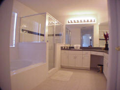 Home 4684-E is an executive classification, luxurious 4-bedroom, 3-bathroom 2 storey home with its own private screened pool and Jacuzzi. The home also comes with high speed internet. This home is located in Cumbrian Lakes; a peaceful subdivision situated approximately 15 minutes from Walt Disney World entrance and is conveniently located for the other attractions. This home has a maximum sleeping capacity for 8. The master bedroom has a king-size bed, the 2nd bedroom offers a queen-size bed; the 3rd & 4th bedrooms both have 2 twin-size beds in each. There are 2 living room areas in this home. Beautifully furnished there is ample kitchen equipment, range, microwave, refrigerator-freezer, towels, linens, washer, drier etc. There is cable TV DVD & VCR in the living room, TV’s in all of the bedrooms. This home is pet free and non smoking. The garage has been converted into a games room with foosball and various other games and internet is available. |